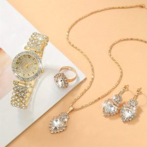 6 pièces Montre sans Boite pour femme , Ensemble Bijoux Quartz avec Collier, Bracelet, Bague et Boucles d’Oreilles