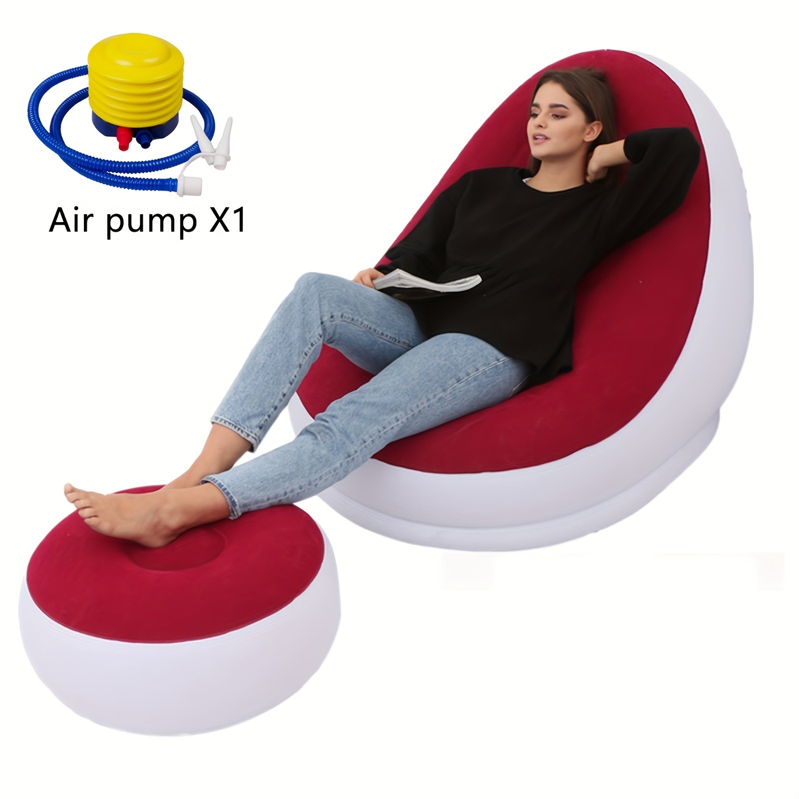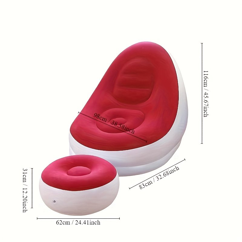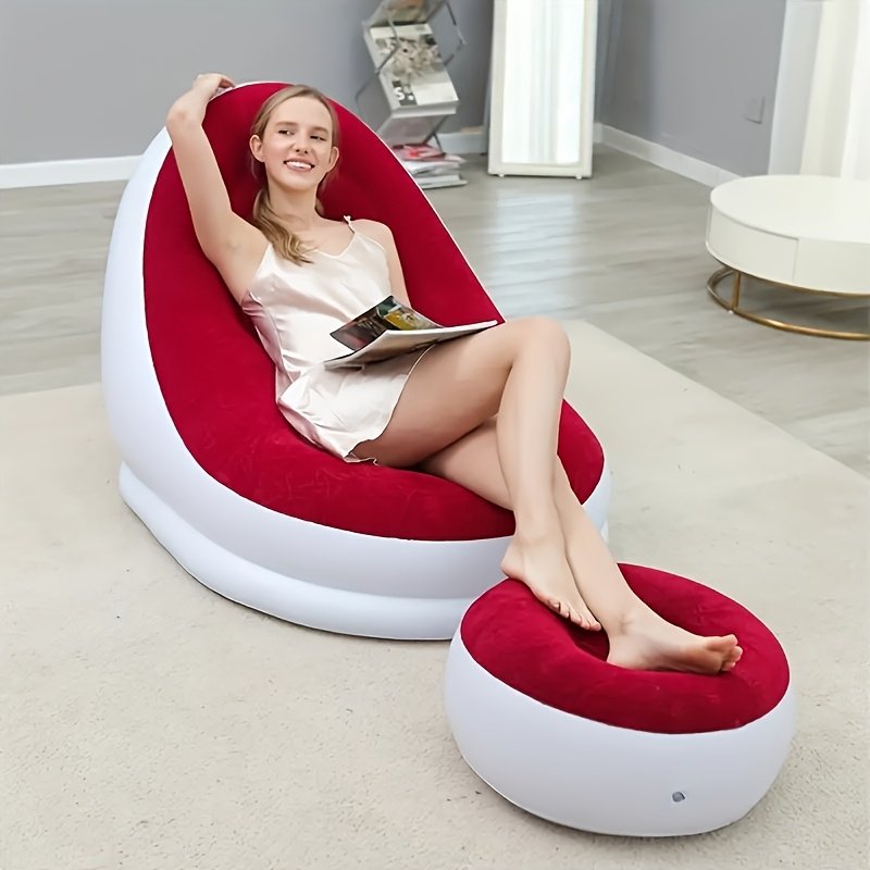 Chaise longue gonflable blanc et rouge avec repose-pieds – Légère, portable, matériau en caoutchouc facile à nettoyer, parfaite pour la relaxation en intérieur/extérieur