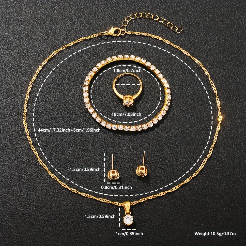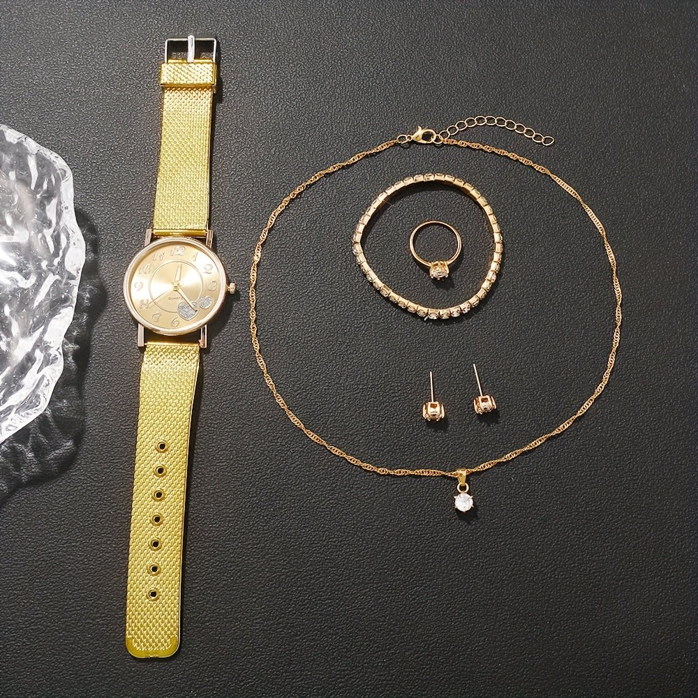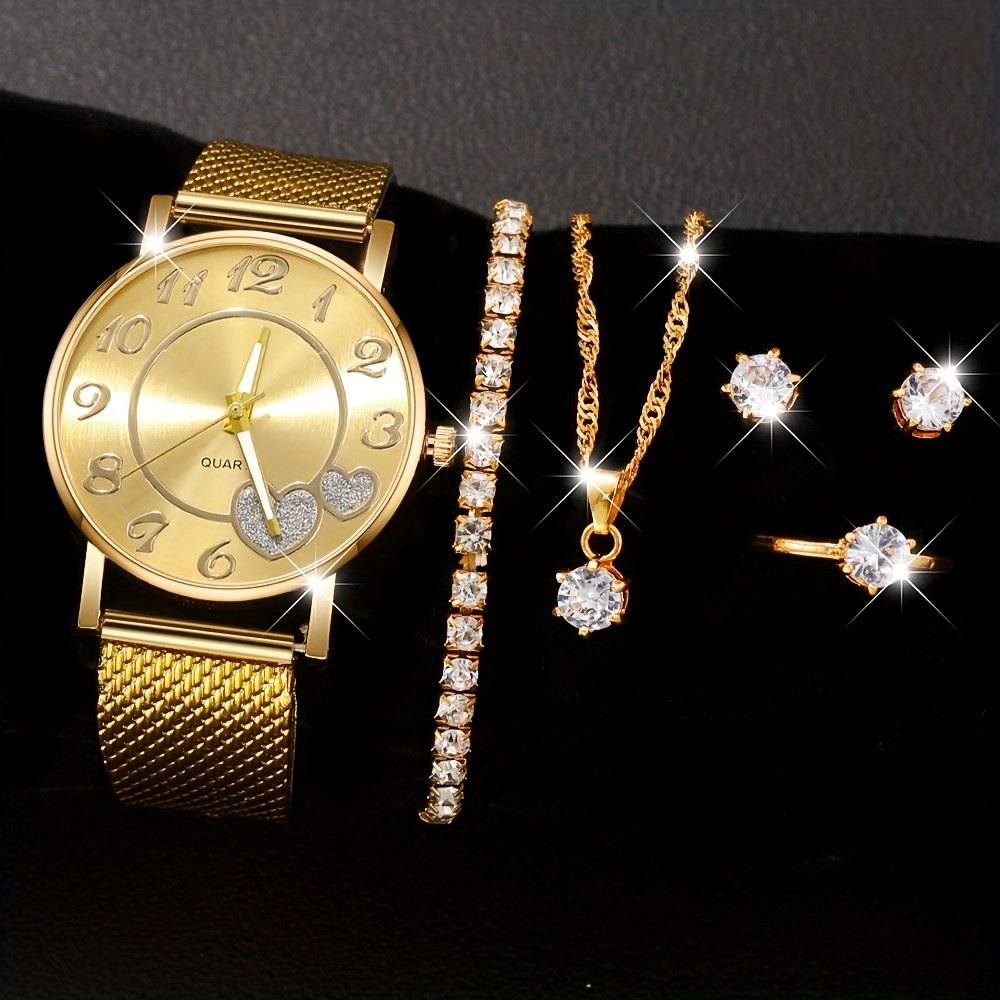 Ensemble de montre en or pour femme, bague de luxe, collier, boucles d'oreilles, bracelet, 5 pièces