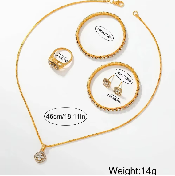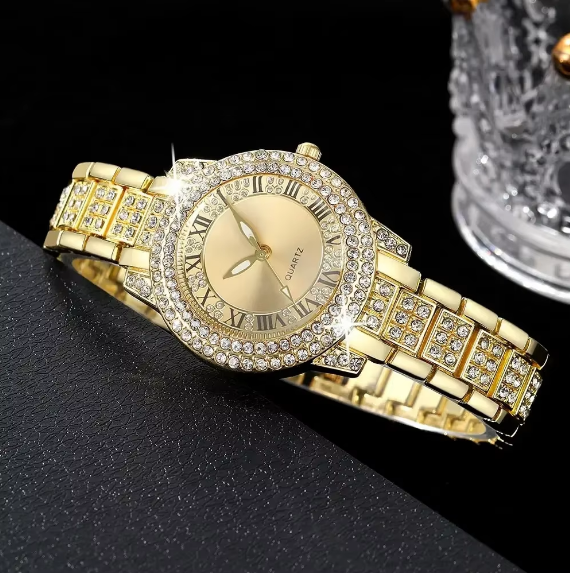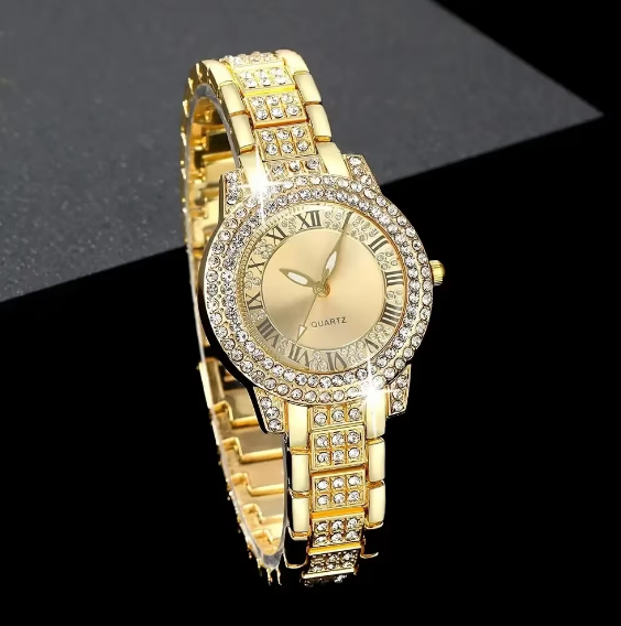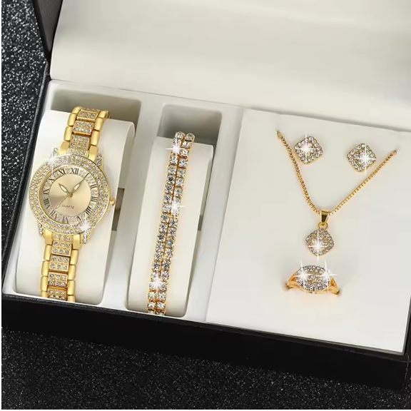 Ensemble de Luxe sans Boite pour Femme , Montre à Quartz Ronde Dorée et Bracelet Brillant, Collier, Boucles d’Oreilles, Bague – 6 Pièces