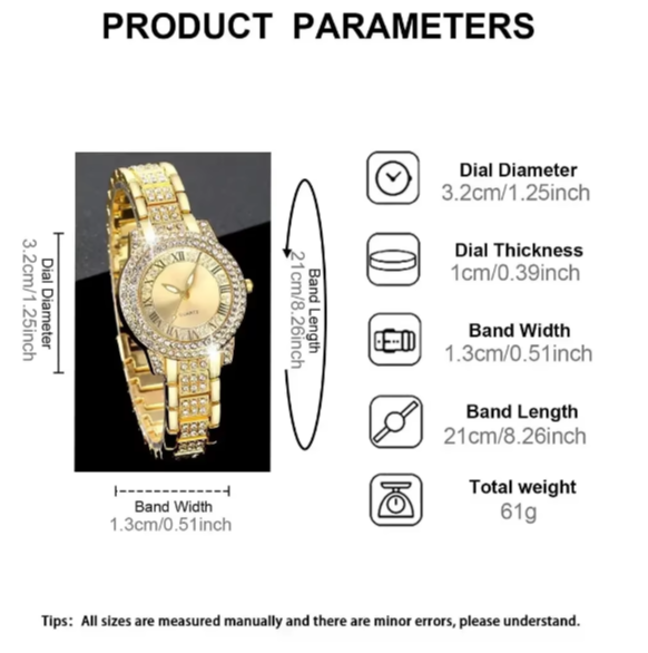 • Ensemble de Luxe sans Boite pour Femme , Montre à Quartz Ronde Dorée et Bracelet Brillant, Collier, Boucles d'Oreilles, Bague - 6 Pièces